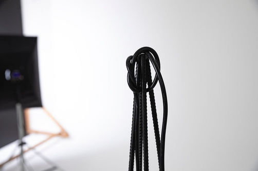 Luminária com estrutura de barra de aço e pendente de amarração de cimento. Lâmpada inclusa no preço.
